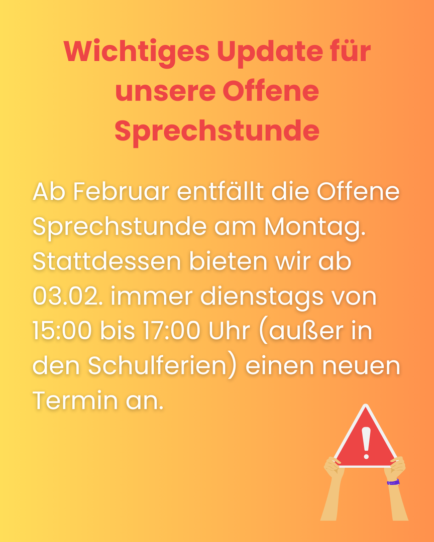 Statt Montag 14:30 Uhr - 16:30 Uhr, wird die Offene Sprechstunde in unseren Räumen in der FABRIK, Habsburgerstr. 9, ab Februar Dienstag 15:00 Uhr - 16:00 Uhr stattfinden. In den Schulferien findet die Offene Sprechstunde nicht statt.